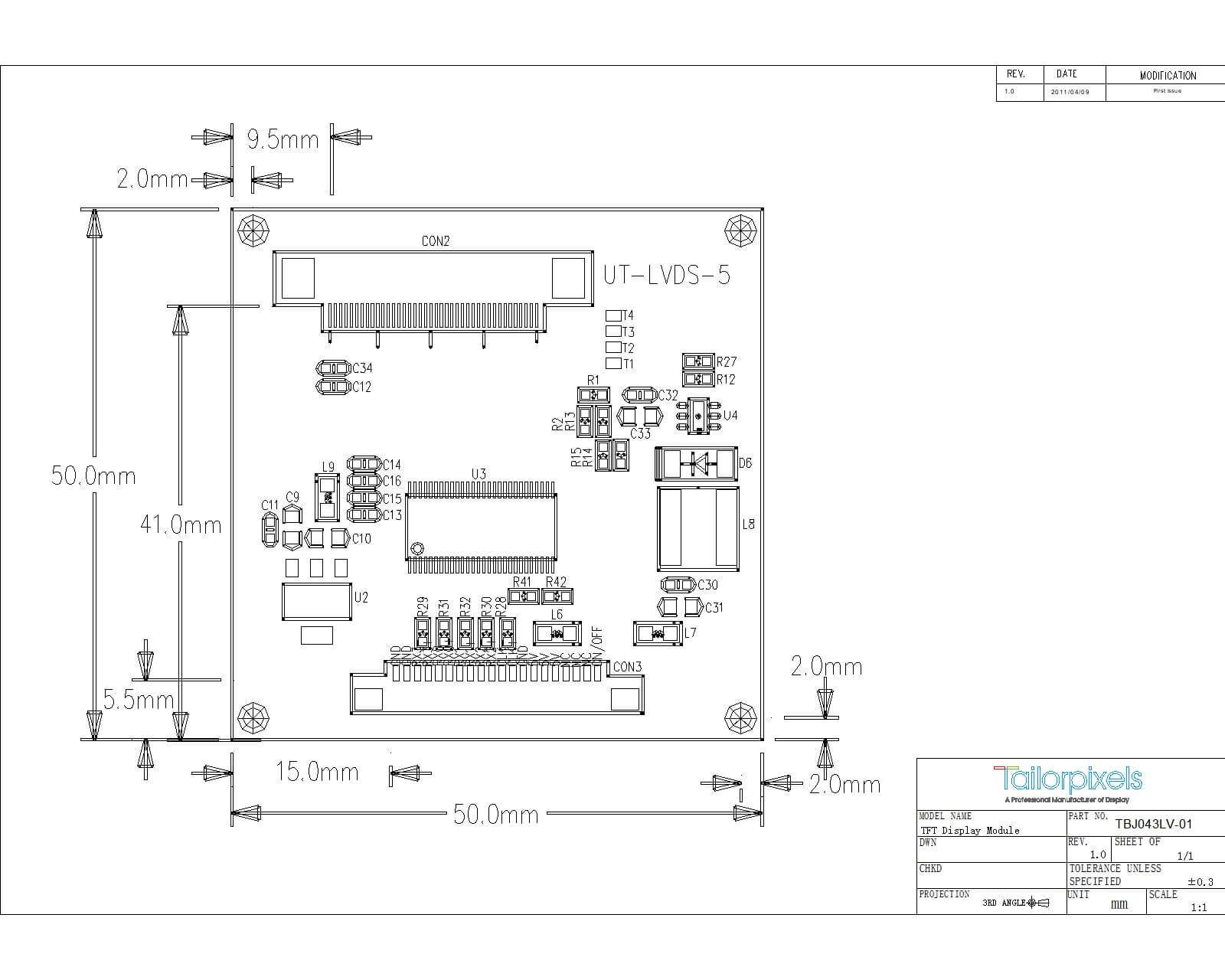 TBJ043LV-01 Scaler Board | Convert RGB 40-pin to LVDS | Convert LVDS signal into TTL signal |